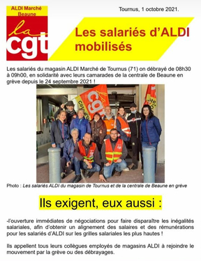 Après avoir constaté des écarts de salaires pouvant aller jusqu'à 300€ par mois sur le même poste entre les centrales régionales, les salariés ALDI Beaune sont mobilisés depuis le 24 septembre afin d'obtenir une harmonisation des salaires sur tout le territoire national.