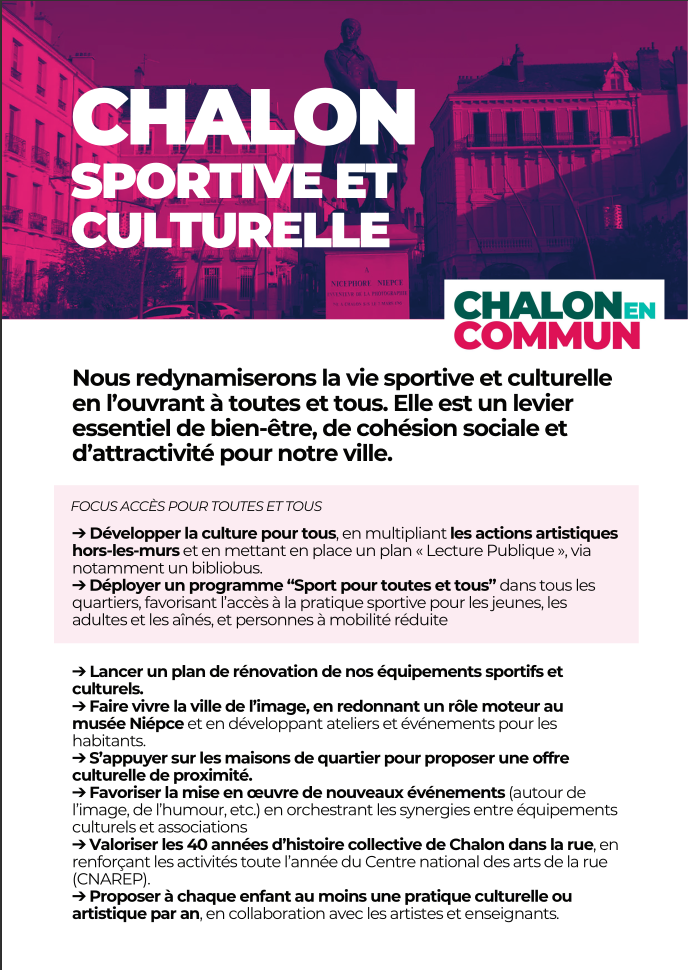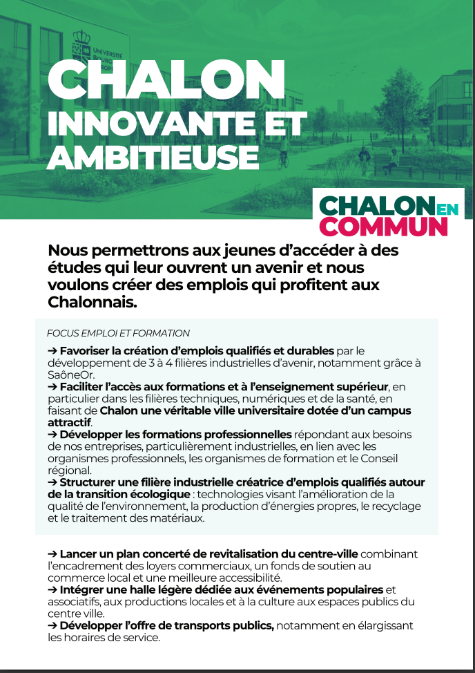 En mars prochain, les Chalonnaises et les Chalonnais feront un choix décisif pour l’avenir de notre ville. Ce choix engage bien plus qu’un mandat. Il engage la capacité de Chalon à protéger ses habitants, à se renouveler et à préparer l’avenir dans un monde traversé par de profondes transformations sociales, écologiques et économiques.